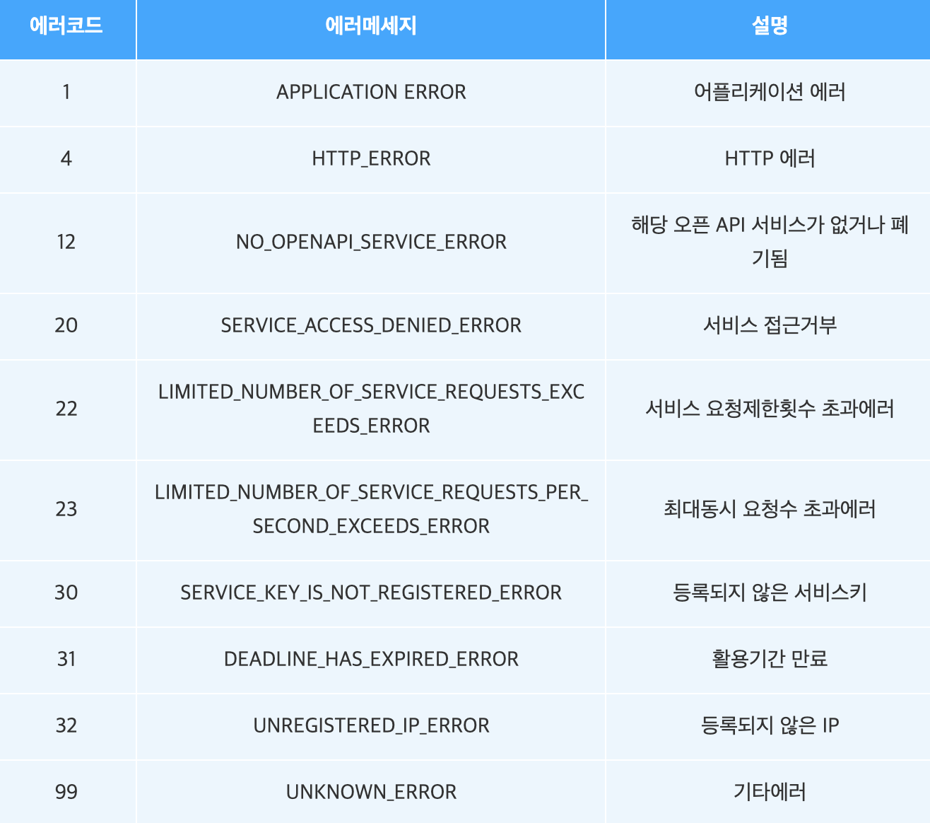 공공데이터포털의 오픈 API 에서 response 되는 에러코드는 위와 같다.