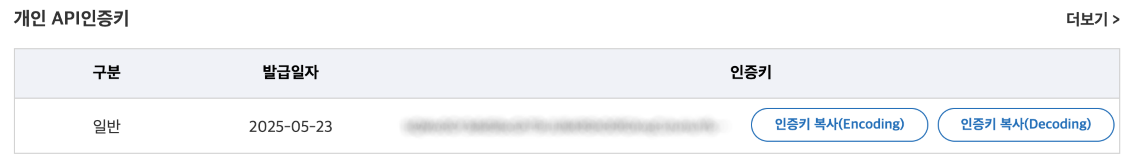[마이페이지] > [데이터 요청] 에서 보면 위와 같이 발급받은 개인 API 인증키를 확인할 수 있는데, Spring Boot 의 Service 코드에서 UriBuilder 를 통하여 serviceKey 값이 build() method 를 통하여 자동으로 encoding 되기 때문에 Decoding 된 인증키를 사용해야 한다.