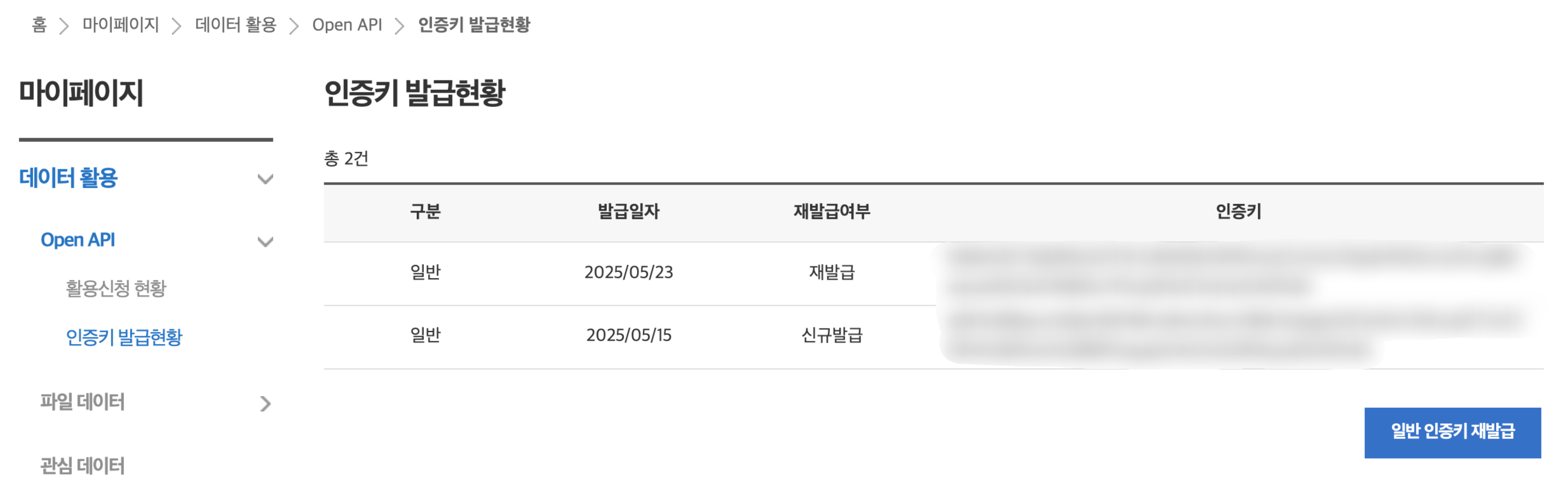발급받은 인증키에 오류가 있어 재발급을 하는 것도 하나의 방법일 수 있다. 하지만 신규/재발급의 경우 해당 정보가 기관 서버로 동기화되는데 약 30분에서 1시간정도 소요될 수 있다.