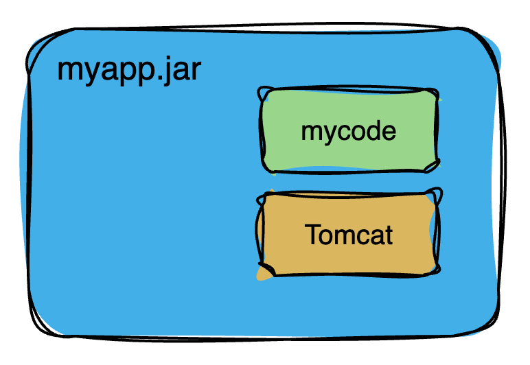 Spring Boot 는 내장된 HTTP Server 를 제공하기 때문에 별도로 다른 서버를 설치할 필요가 없다. 위 그림과 같이 JAR 파일에는 application code 뿐만이 아니라 서버도 포함되어 있는 것이다.