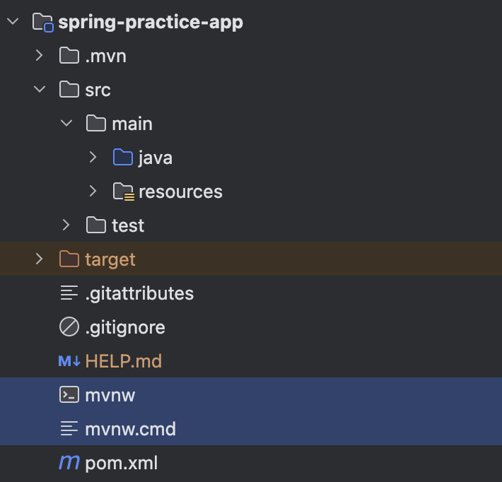 directory 를 보면 mvnw.sh 와 mvnw.cmd 두 개의 wrapper 가 존재하는데, 하나는 Linux/Mac 환경에서 사용되는 shell script 형식의 파일이고, 다른 하나는 Windows 환경에서 실행할 수 있는 파일이다.