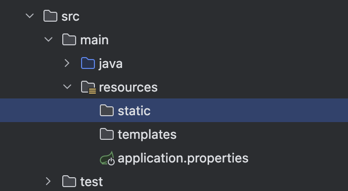 다음은 static directory 에 대한 부분이다. 이 영역에는 static resources 들이 저장되는 곳이다. HTML, CSS, JavaScript 등의 파일과 이에 사용되는 image 파일들이 여기에 속한다. 해당 파일들은 Spring Boot 가 자동으로 load 하여 사용한다.