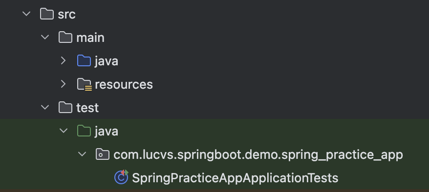 마지막으로 Unit Test 에서 사용되는 test directory 이다. Spring Initializr 를 통하여 기본 Test class 가 하나 만들어져 있으며, 개발자가 원하는 unit tests 를 추가할 수 있다.