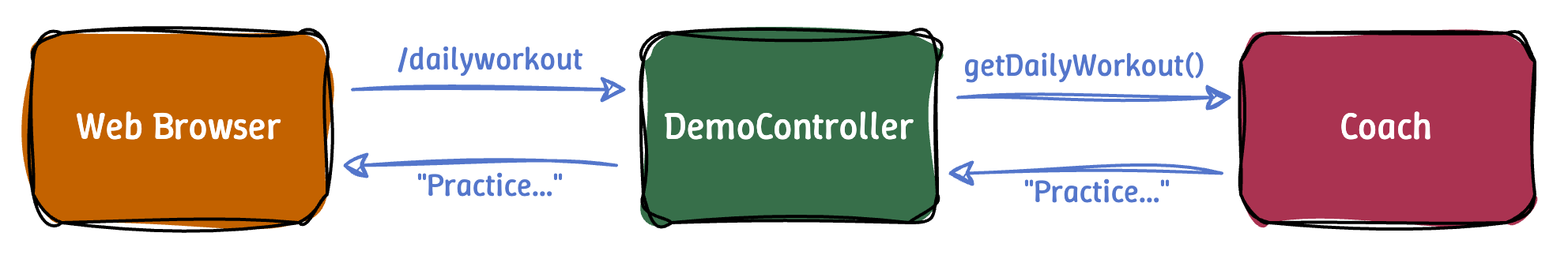 우선 위의 시나리오를 적용해보기로 하자. 우선 /dailyworkout endpoint 에 접근하면, DemoController 라는 controller 를 통하여 Coach object 의 getDailyWorkout method 를 실행하도록 하는 방식이다.