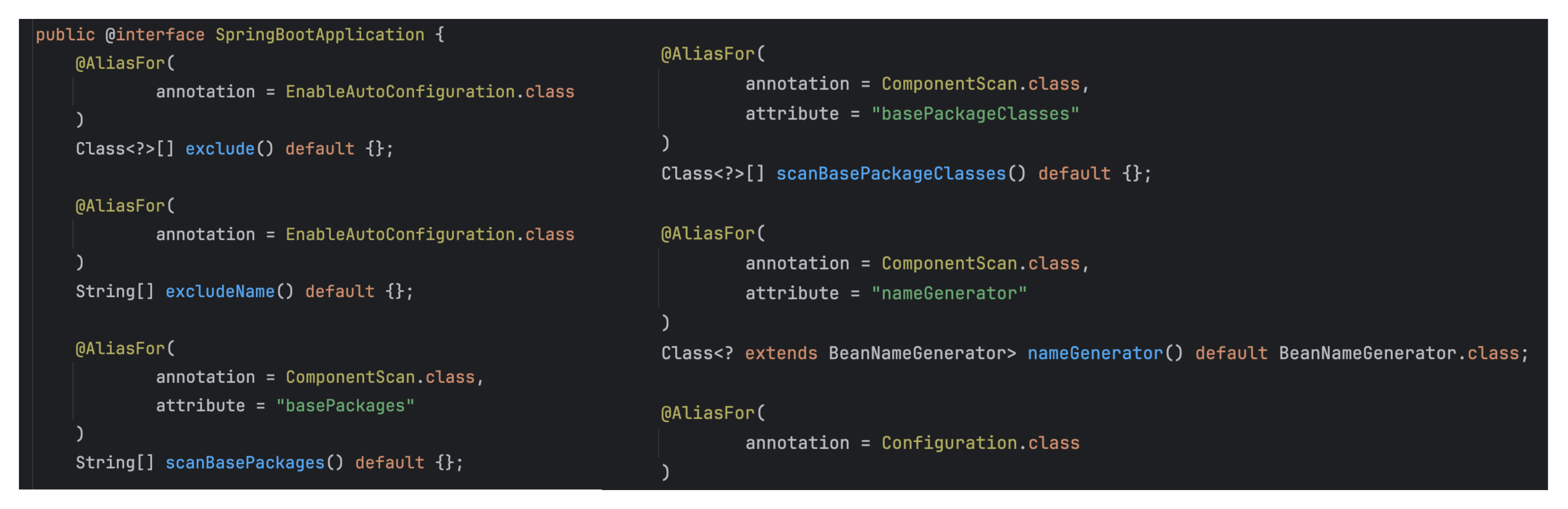 @EnableAutoConfiguration: Spring Boot에서 classpath 에 있는 라이브러리를 기반으로 필요한 설정을 자동으로 구성@ComponentScan: 지정된 package 와 하위 package 를 스캔하여@Component,@Service,@Controller,@Repository등과 같은 annotation 이 붙은 class 를 자동으로 Bean Definition 에 등록@Configuration:@Beanannotation 을 통하여 extra Beans 를 등록하는 Bean 정의 class 임을 나타냄