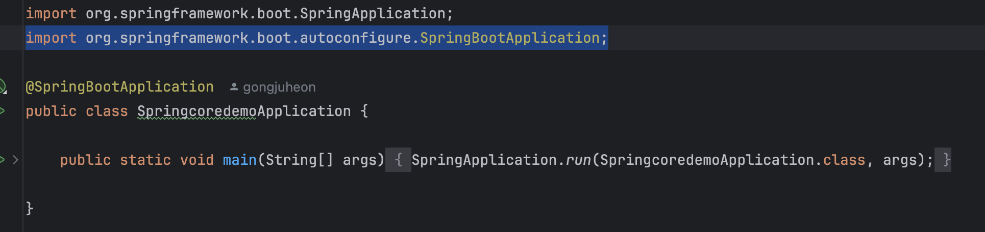 Spring Initializr 가 자동으로 생성해준 Spring project 의 Main Spring Boot Application class 코드를 살펴보면 위쪽에 @SpringBootApplication annotation 을 사용하였고, 이를 사용하기 위하여 해당 package 가 import 된 것을 알 수 있다.