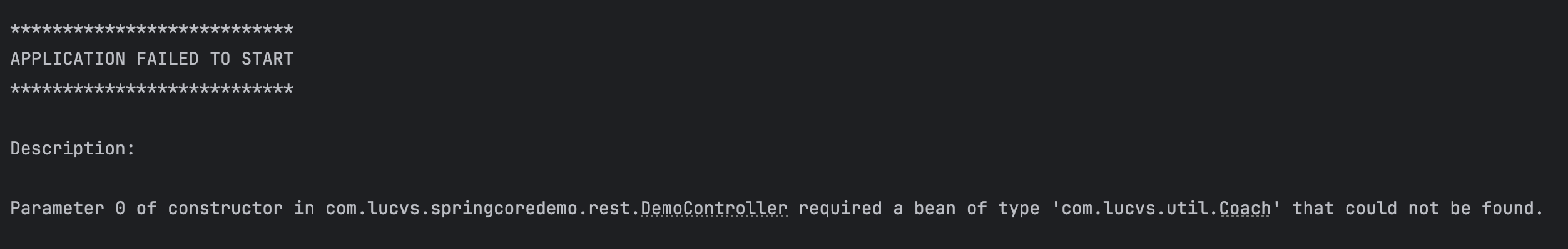보통 error 는 기분이 좋지 않지만, 의도된 error 를 발생시킬 때에는 약간의 쾌감이 존재한다. 역시나 error 가 발생한 것을 볼 수 있다. error message 를 보면 com.lucvs.util.Coach 이라는 type 의 Bean 을 찾을 수 없다고 한다.