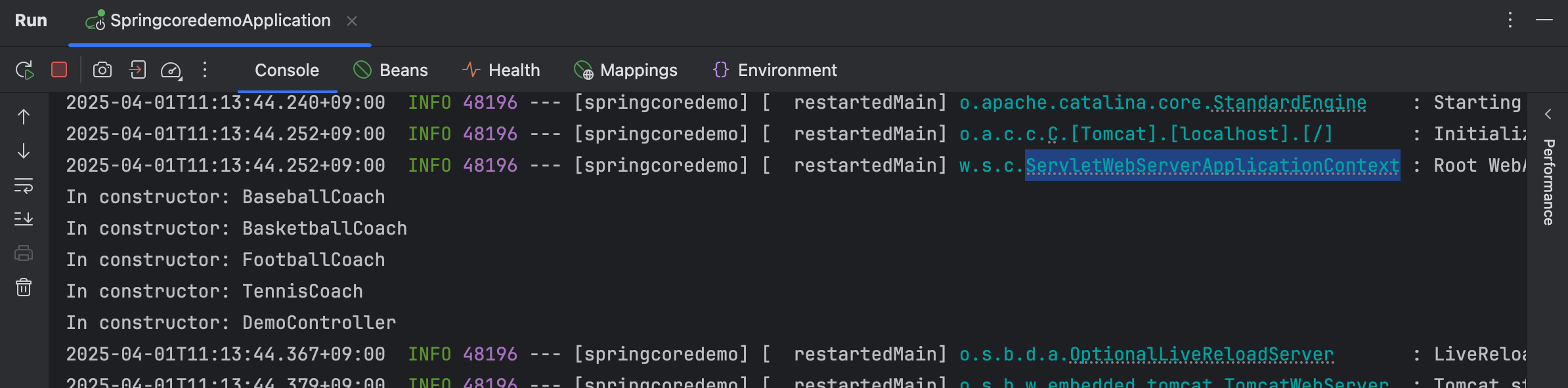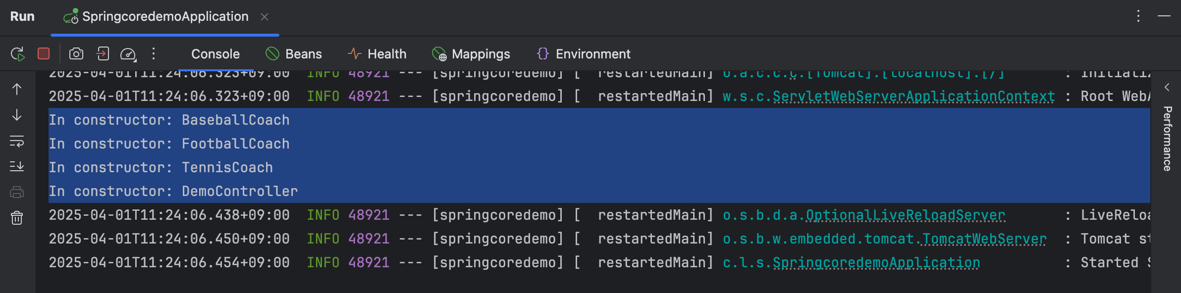 위와 같이 BaseballCoach Bean 만 제외하고 initialized 된 것을 볼 수 있다.