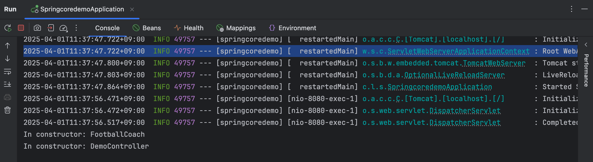 보면 ApplicationContext 가 Bean 들을 생성하고 initialize 하여 각 Bean 에 해당하는 출력을 볼 수 있다.