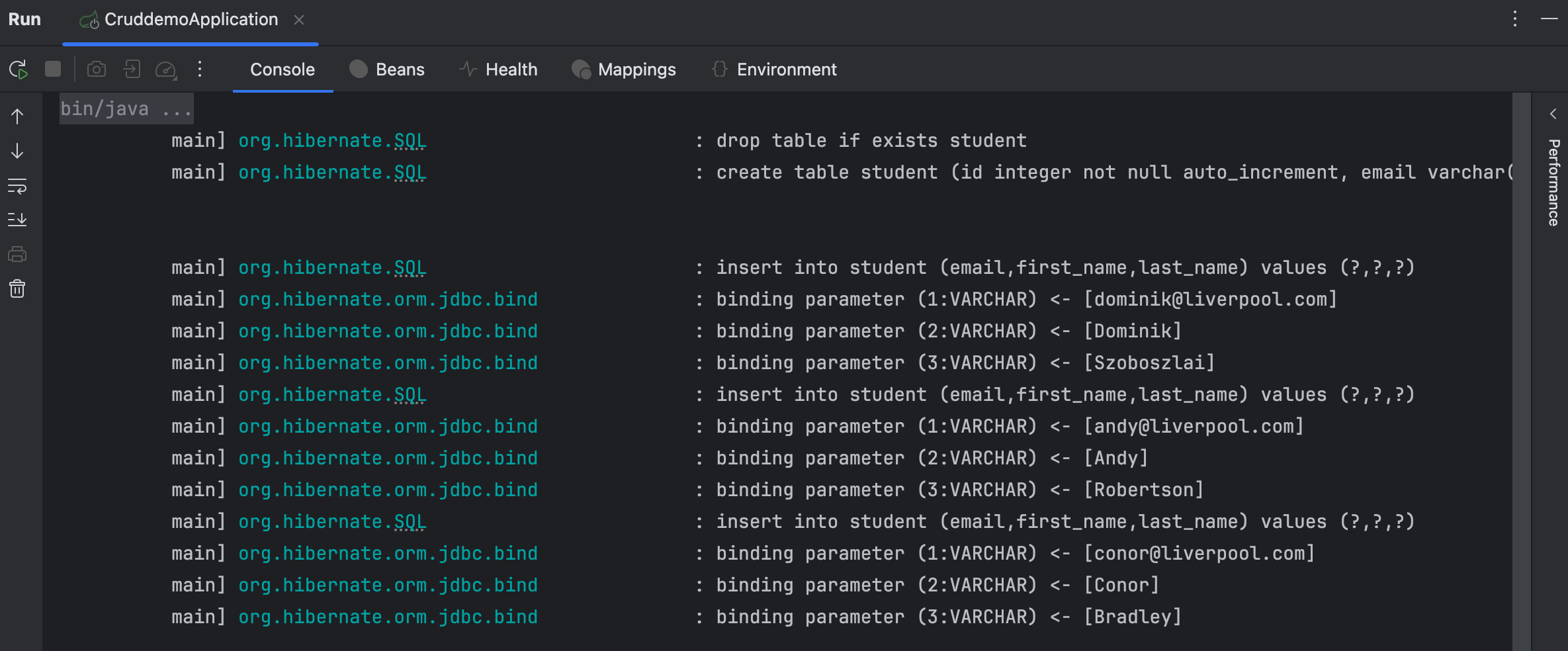 우선 Log 상에서는 위 이미지와 같이 drop 에 사용한 SQL, create 에 사용한 SQL, 그리고 table 에 row 를 insert 하는 SQL 들이 logging 된 것을 볼 수 있고, insert query 에 사용된 parameter 에 각각 어떤 값들이 mapping 되었는지도 확인할 수 있다.