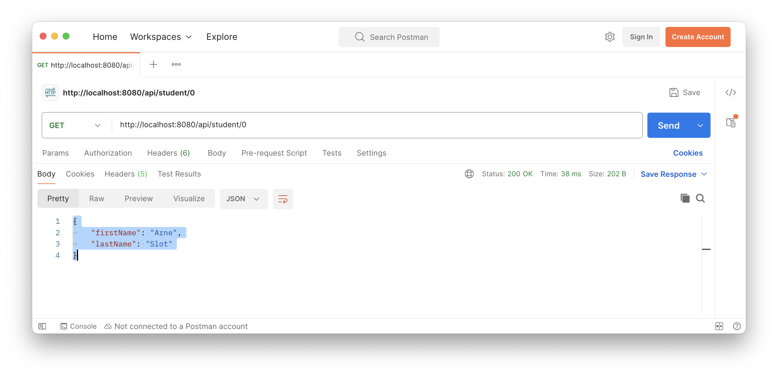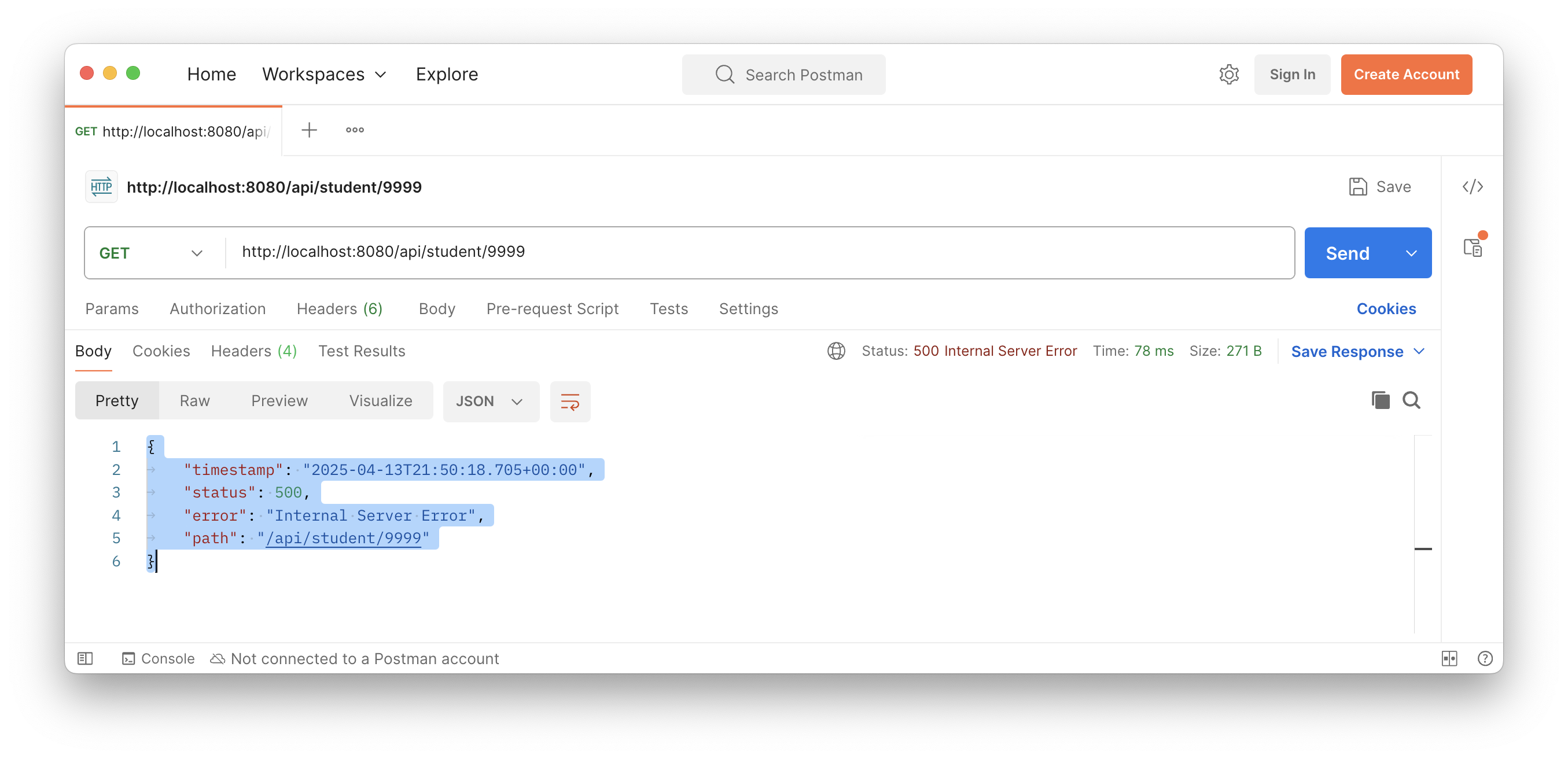 이제 http://localhost:8080/api/student/0 로 GET method 를 사용하여 request 를 보내보자.