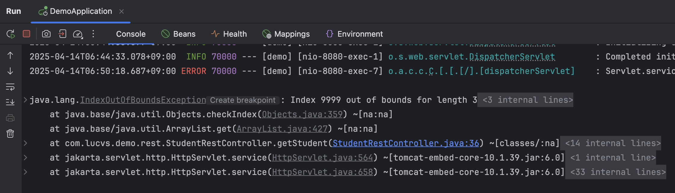 status code 는 500 으로, Internal Server Error 가 발생하였다. 그러나 Internal Server Error 일 뿐, 내부적으로 어떤 것에 의하여 오류가 발생했는지는 알 수가 없다.