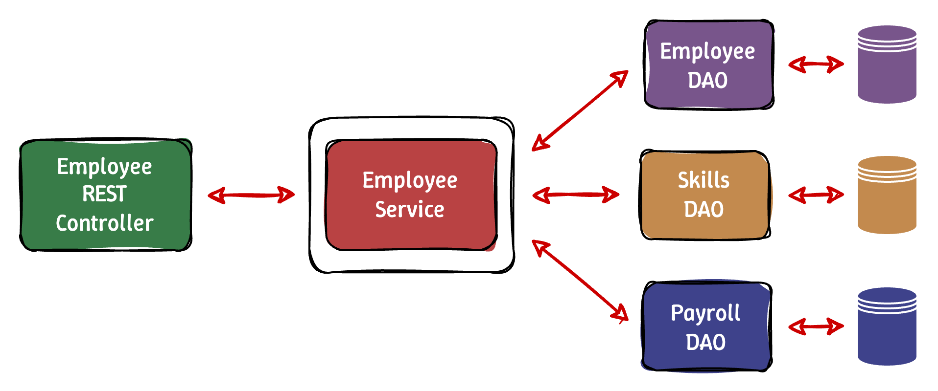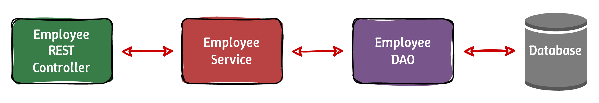 }EmployeeDAO 를 declare 하고 injection 하는 대신, EmployeeService 를 declare 하고 injection 하는 방법으로 사용한다. 이렇게 되면 최종적으로 Controller 는 Service 를 바라보게 되고, Service 는 각각의 DAO 를 바로보게 되는 것이다.