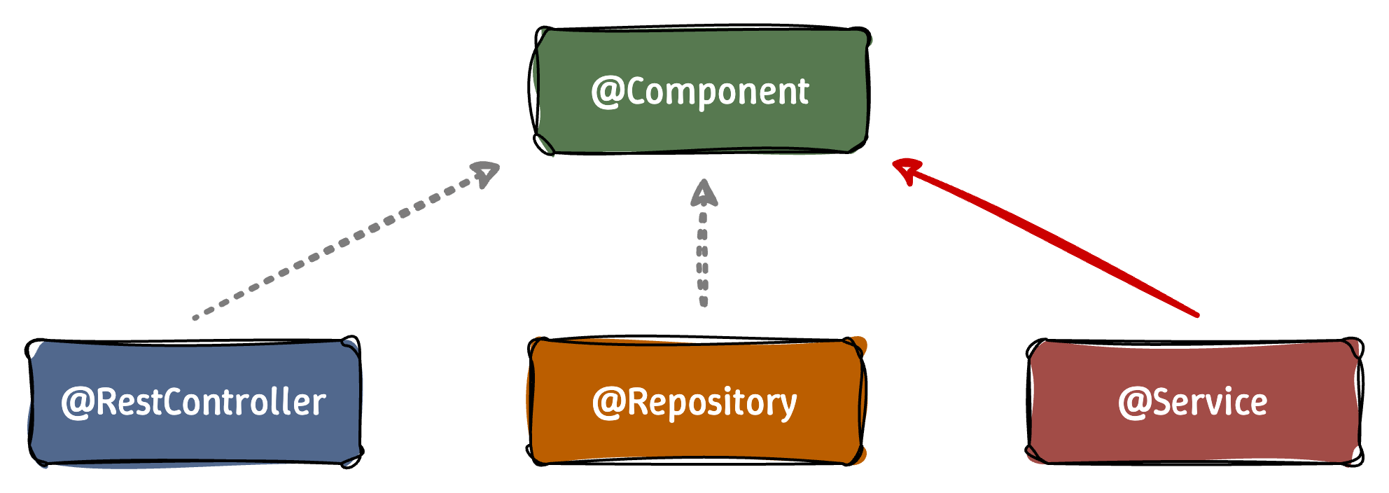 Service Layer 로 사용할 class 에는 @Service annotation 을 사용해야 하는데, @Service 는 위와 같이 @Component 의 Specialization 된 annotation 의 형태이다.