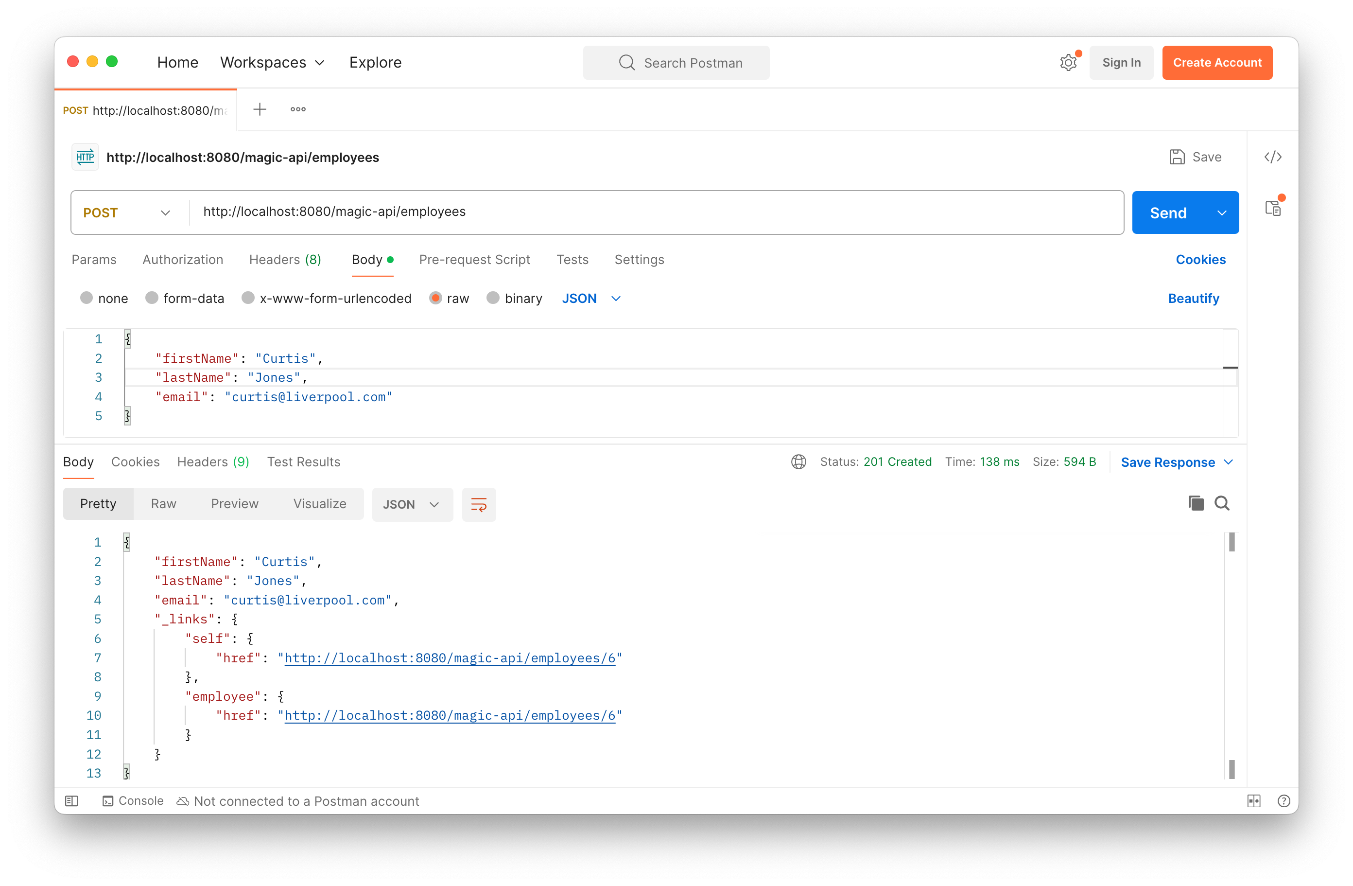 또한, PUT 이나 PATCH method 를 사용할 때, Spring Data REST 는 id 를 오직 URL 에서만 사용 가능하다. 만약 id 값을 request body 에 포함시킨다면, 이에 대한 위험성은 여기서 확인 가능하다. 단순하게만 설명하면, Client 가 고의적으로나 실수로 기존 data 를 변경시킬 수 있기 때문이다.