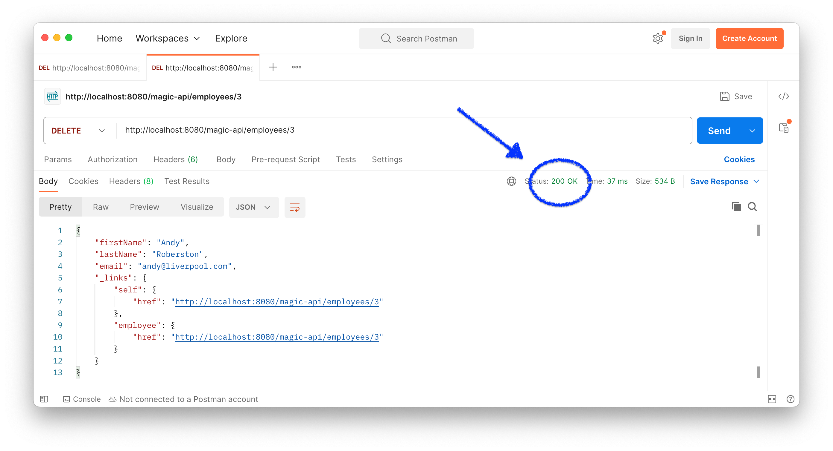 PATCH 도 잘 작동하며, 아래와 같이 DELETE 도 성공적으로 작동한다.