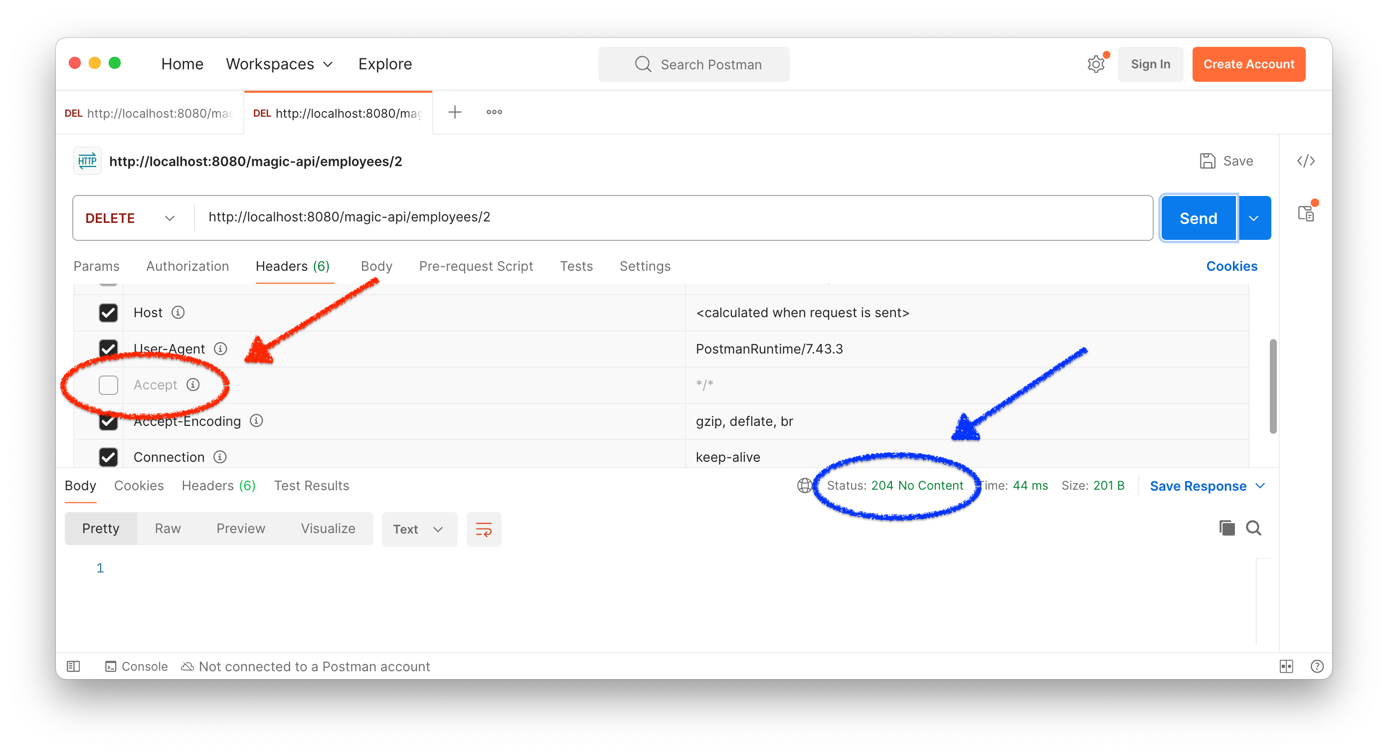 Postman 을 통하여 Accept variable 을 설정하지 않으면 아래와 같이 204 No Content 가 return 되는 것을 볼 수 있다.