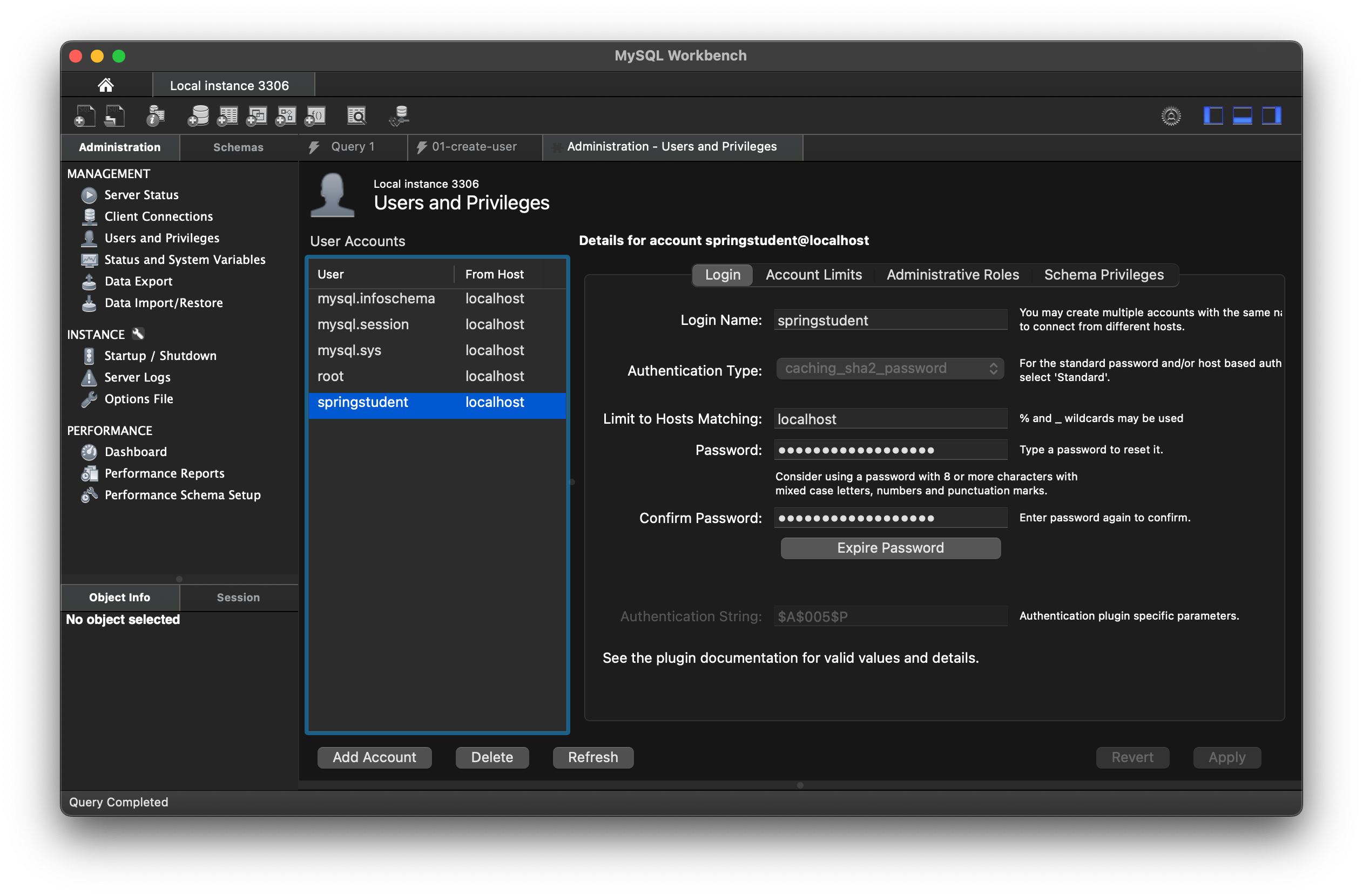 이후 모든 script 를 실행하고, [Administration] > [Users and Privileges] > [User Accounts] 에서 살펴보면 아래와 같이 springstudent 의 이름으로 새로운 계정이 생성된 것을 볼 수 있다.
