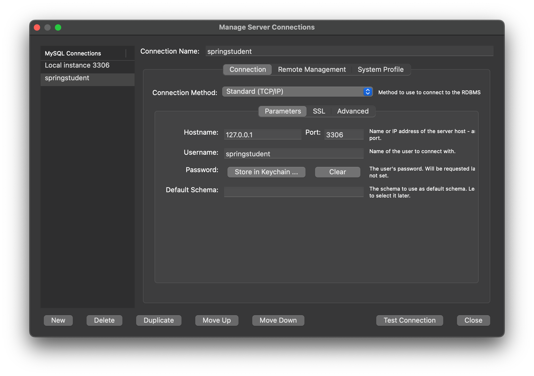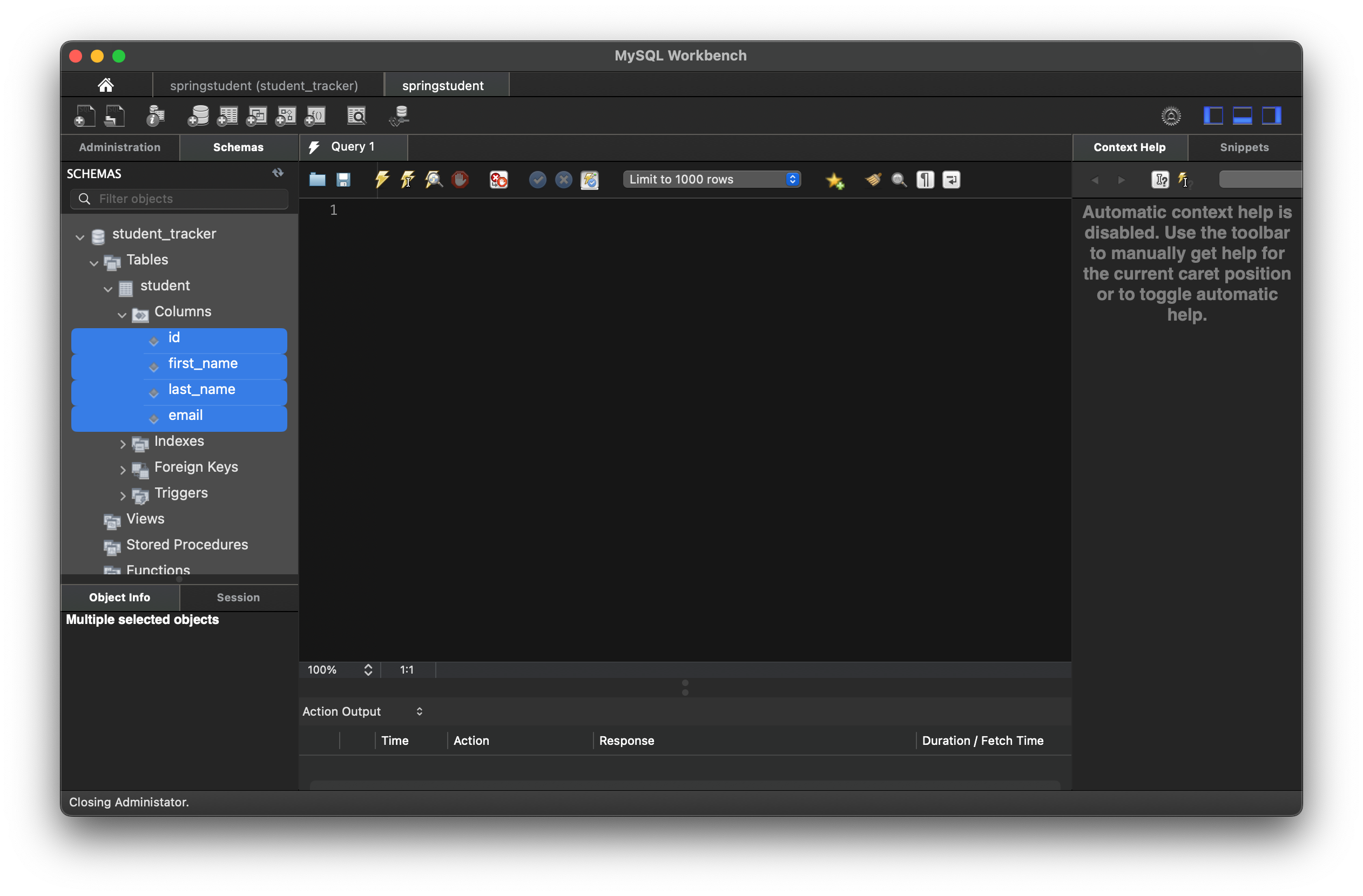 이후 위와 같이 springstudent 계정에 대한 새로운 Connection 을 생성한다. 이후 해당 Connection 에 접속한 뒤에 다음 script 를 실행하여 student_tracker 이라는 이름의 database 를 만들고, 해당 database 안에서 student 라는 table 을 생성한다. table 의 구조는 다음 코드와 같이 구성한다.
